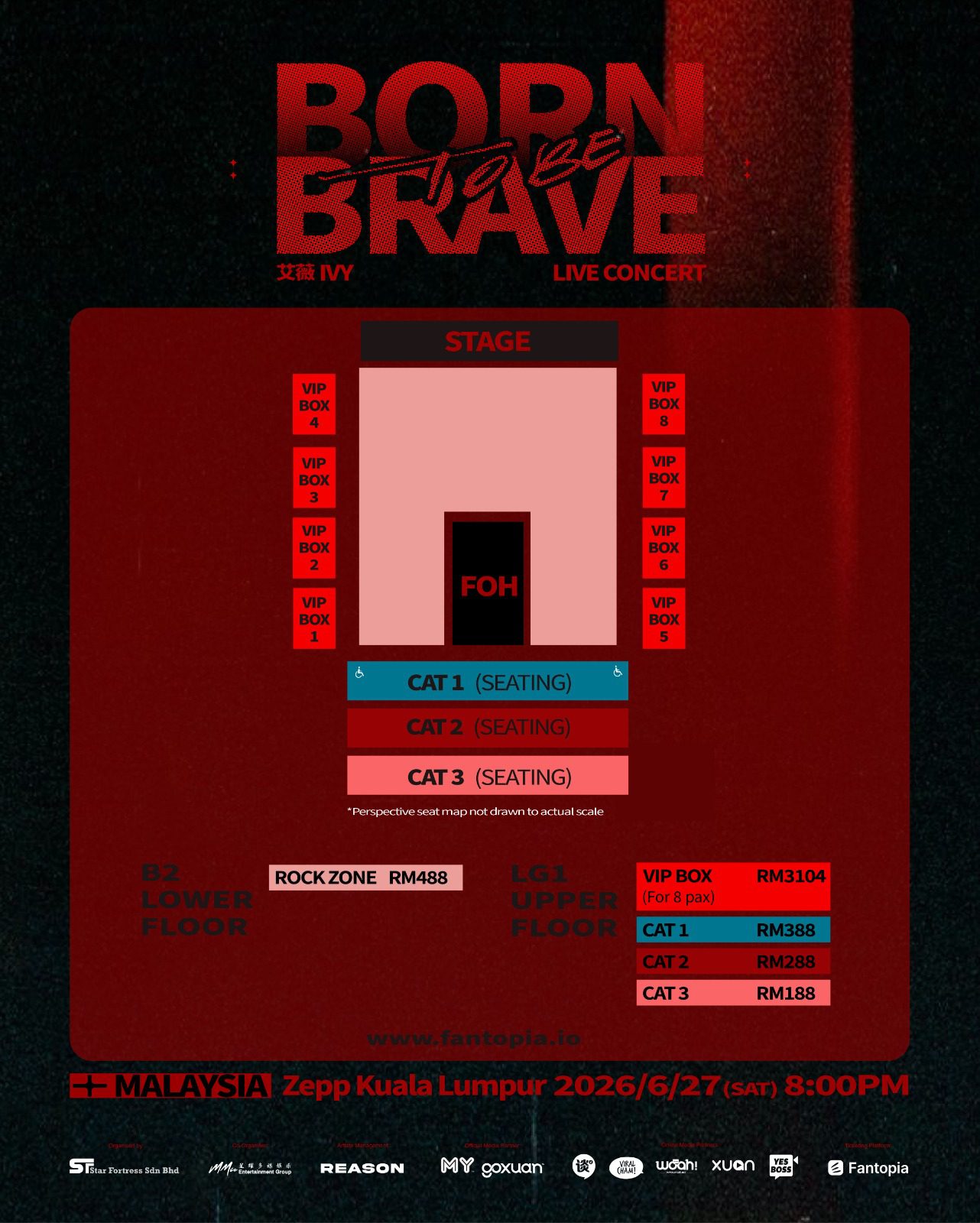 票价:RM3,104 (贵宾厢房-8 位)、RM488、RM388、RM288 及 RM188 (不包含⼿续费)
