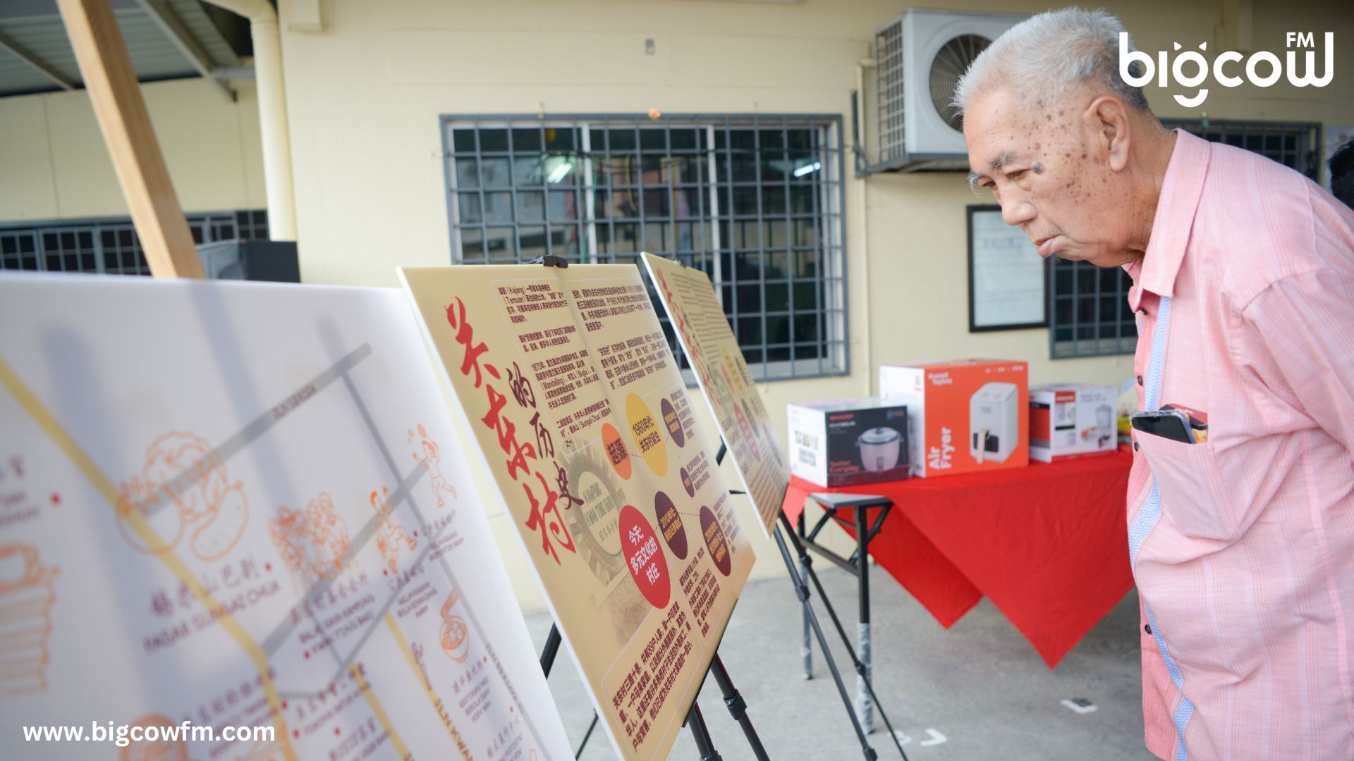 一位民众仔细地透过展览了解关东村的简史和社区风貌